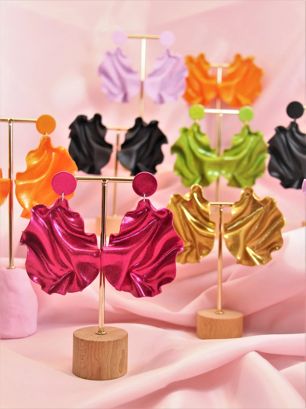 I sculpt each earring in the Satin collection by hand in polymer clay, made in Europe. My production is very small scale and I don't let any of the clay go to waste. I also have a collection of earrings made from acrylic, which is of course not environmentally friendly. Right now I’m looking at switching to recycled acrylic, as a replacement for these.